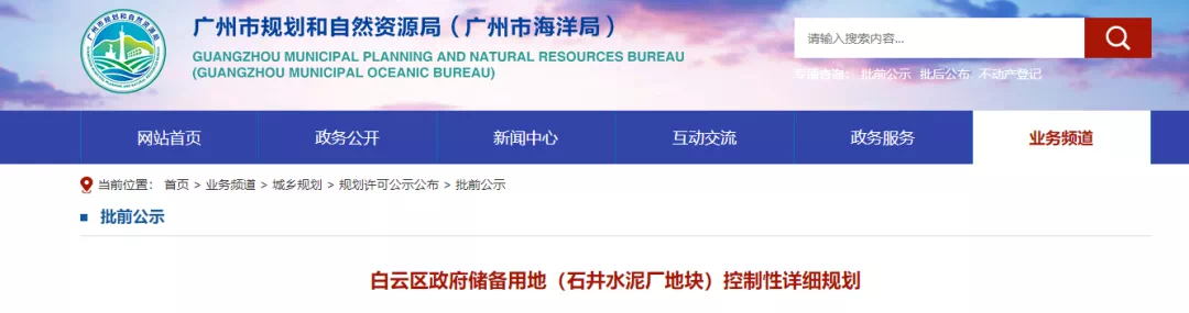 4月10日,广州市规划和自然资源局发布《白云区政府储备用地(石井水泥厂地块)控制性详细规划》批前公示。