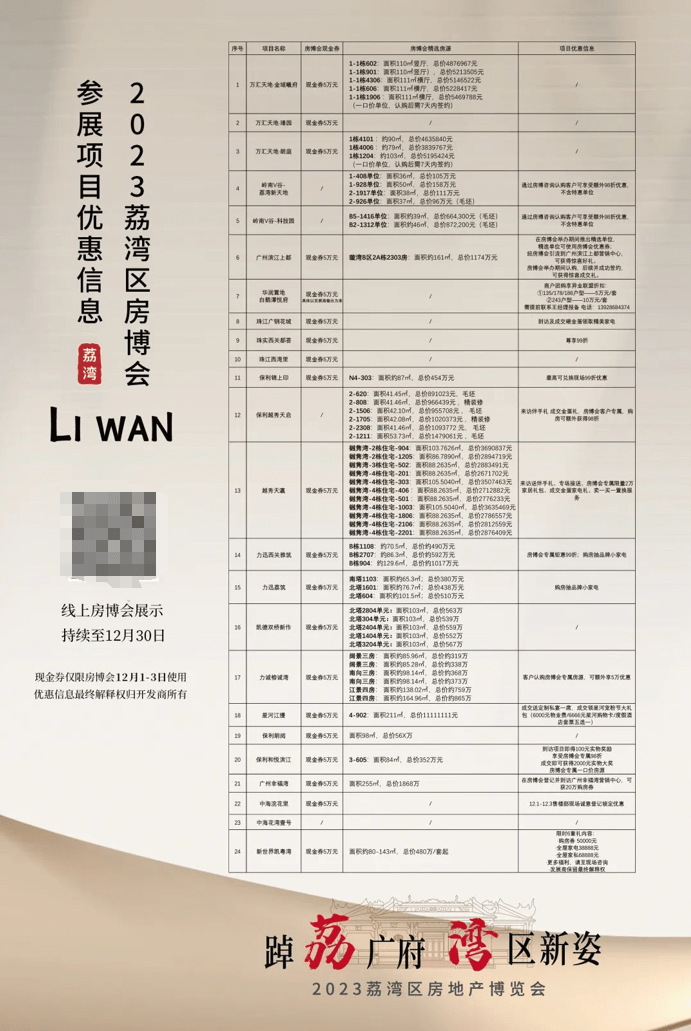 为保护及传承千年文脉、千年商脉,省市区政府上下齐心,依托“文、商、旅、创、居”多方位协同发展,正在奋力书写“老城市新活力”的新篇章。从多种重磅规划逐步落地中可以看出,今、明年都是荔湾区高质量发展年,千亿沿江经济带的配套建设正在稳步推进,荔湾发展蓝图也在逐步兑现中。我们看到,区政府在加快文旅商相融相促的同时,同步对区域交通、城市界面等进行完善及提升,“两桥三隧五路六轨道”等16个重大交通基础设施、“1+4+N”(城市-地区-社区)三级公共中心体系等都在稳步推进。目前,公共配套、公共环境及公共服务水平等方面都有了显著的提升。同时,在万科、中海、保利等多家知名房企主动融入城市更新及配套建设后,荔湾区多个板块已焕然一新,如,广钢新城,已从一个旧厂房区跃升为大型宜居新城。还有花地湾、白鹅潭、广船等板块,在房企全方位助力及集体赋能下,正迎来一场巨大的蜕变,逐步形成宜居宜业的优质生活圈。为了荔湾老城焕发新活力,广州市房地产协会也来助力,在广州市住房和城乡建设局、广州市荔湾区住房建设和园林局的指导下,主动发起一场以“踔‘荔’广府·湾区新姿”为主题的荔湾房地产博览会,让更多人了解宜居宜业的荔湾。这场房博会,将于2023年12月1日-12月3日在领展购物广场南广场开启。目前,已吸引了来自保利发展、保利置业、力诚集团、大成地产、华润置地、凯德、力迅、万科、新世界、星河、医药港、越秀、中海、中信泰富地产、珠实等知名房企二十多个精品项目参展。在房博会现场,不仅能一站式尽阅全区楼盘,还有专属“购房优惠劵”,限线下房博会期间使用(12月1-3日),面额高达5万元,涵盖参展的所有住宅项目。