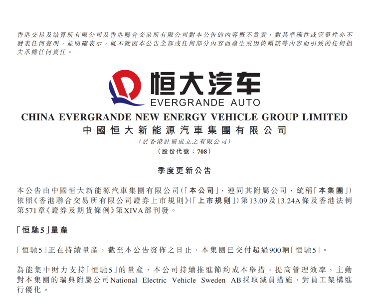 据恒大汽车此前公布,截至2022年12月30日,恒驰5已交付324辆。最新公告显示,截至公告发布之日(3月23日),恒大新能源汽车交付900余辆车。