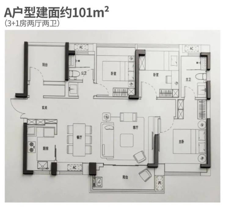 其中,101㎡户型采用横厅设计,餐客厅一体化,同时,在客厅处开了一扇窗,采光俱佳。主卧套房设计,独立的衣帽间、浴室 ,以及多功能空间的打造,居住起来舒适度会更强。如果追求总价低和性价比高,上车族可选择80㎡三房户型。