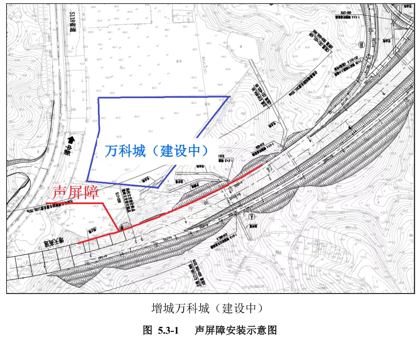 据环评报告对沿线涉及的噪音敏感居民区的红线距离进行了公布,有11个敏感点,其中仅有一处是新建小区,那就是广州增城万科城。