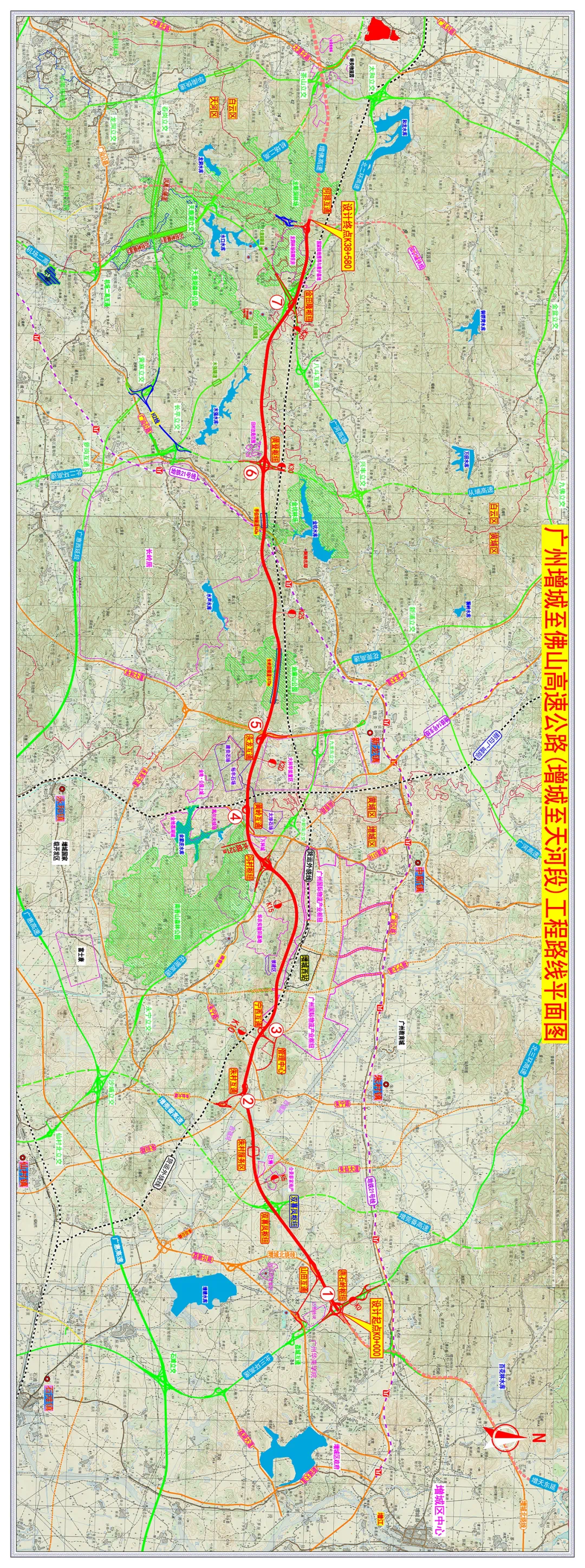 根据项目初步设计,项目起点位于增城区朱村街道山田村,设置燕石岭互通衔接北三环高速,路线呈东西走向,途经增城、黄埔、白云等区,终点设置何排互通衔接知识城快线(规划),向西于增佛高速公路天河至佛山段顺接。