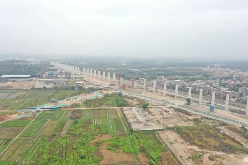仙村大道上跨铁路桥及道路工程北起仙村中学,南至仙村文化广场,全长2.28公里,为双向6车道。该工程正在进行桩基立柱、软基处理、涵洞建设,预计2022年8月通车。