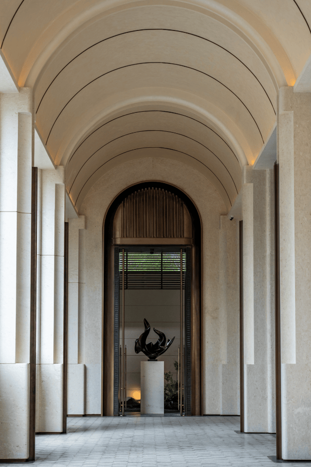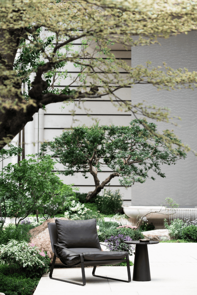项目通过将1/2栋整体抬升约14米,在土地价值寸土寸金的中轴核心,硬生生创造出一个纵向的立体生态聚场。广府岭南园林的池、潭、瀑意境被以现代手法转译,并与悬浮无界泳池、空中观景台等高奢场景融合。更值得深思的是其背后的逻辑转变,它将社区公共空间从“下沉的隐藏会所”,变为“与自然交融的地上立体客厅”。这种设计,标志着顶豪产品的竞争维度,已从室内材质的堆砌,跃升为对 “复合场景与精神体验” 的系统性营造能力,将国际度假酒店的日常感无缝嵌入社区。
