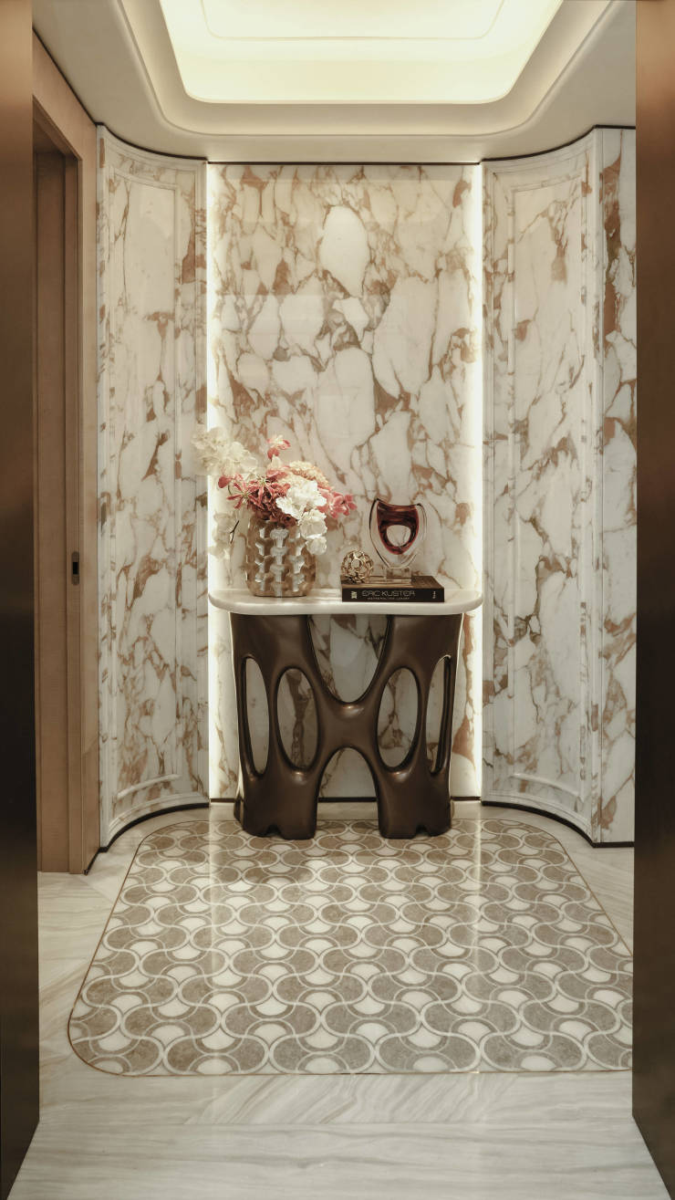 与之配套的,是一套深度集成的收纳系统及中海独有的 “柔性定制”范式 。这远非选择题般的装修套餐,而是允许业主从全球珍稀石材中选择墙面材料,定制室内个性审美造型、材质等,实现从交付房子到共创生活的转变。这种深度介入的定制服务,以往仅见于总价数千万的顶豪,广府萬宸将其引入千万级市场,重塑了该价位段的服务标准。