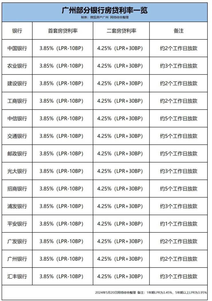 再看房贷利率方面,目前广州首套房贷利率、二套房贷利率普遍为3.85%、4.25%。