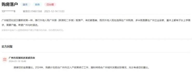 当时,官方答复2024年将启动广州市迁入户政策修订工作。至今,仍无进一步消息。