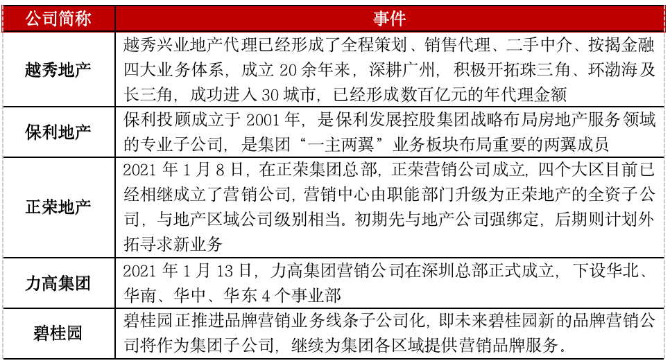 其次,对重要职能部门进行管理精进,聚焦营销职能部门子公司化。2021年以来,已经有正荣、力高两家房企成立了营销子公司,碧桂园目前也在推进品牌营销业务条线子公司化。