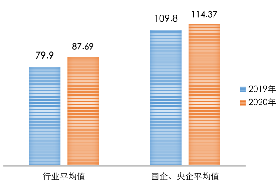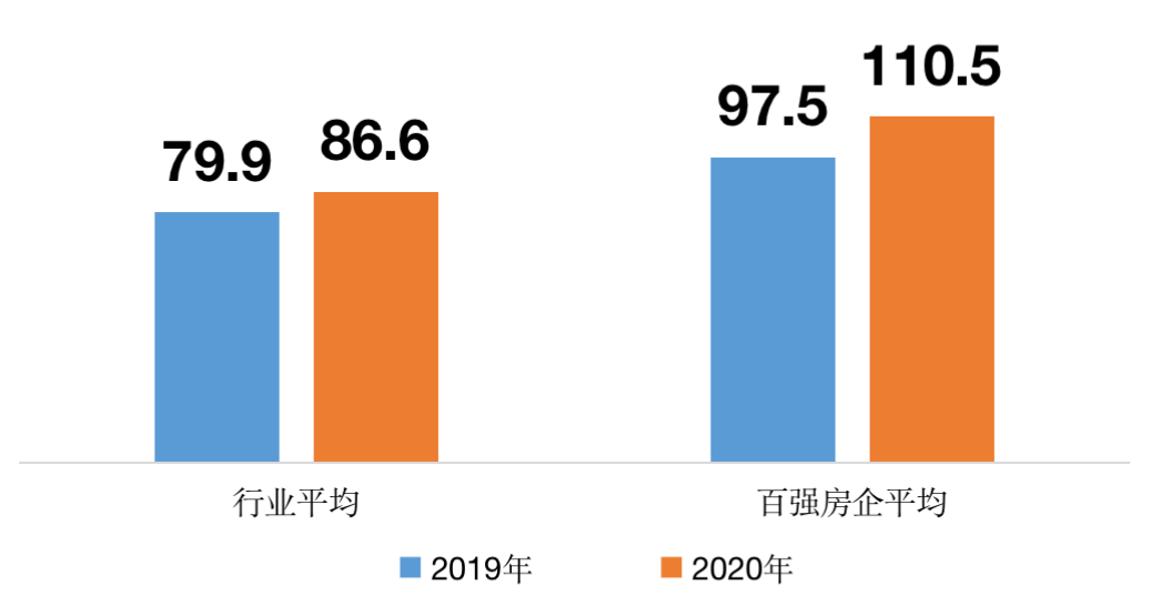 2020年,房地产行业元均销售额达到86.6元,即每支出1元的人工成本,可为企业带来86.6元的销售收入,较2019年的79.9元大幅度提升了18%;百强房企的元均销售额达到110.5元,较行业平均水平高出24元左右,同比涨幅也达到了13%。
