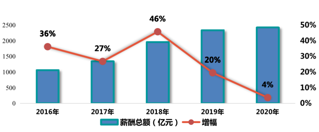 行业薪酬方面,克而瑞统计的2020年80家上市房企薪酬总额近2500亿元,较2019年微张4%,增速较2019年下降16个百分点。较2018年较高点下降42个百分点。这与市场由热转冷、行业整体增速放缓、房企提倡提质增效不无关系。