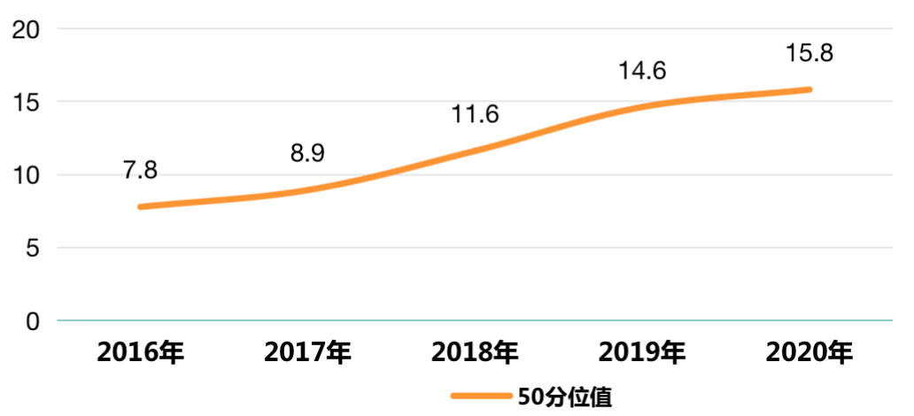 从薪酬总量中位数来看,2020年80家典型上市房企薪酬总量50分位值达到15.8亿元,75分位值则为37.5亿元,总薪酬支出断档较为严重。2020年薪酬总量50分位值保持7%的增速,但与2019年26%增速相距甚远,薪酬支出逐渐回归理性。
