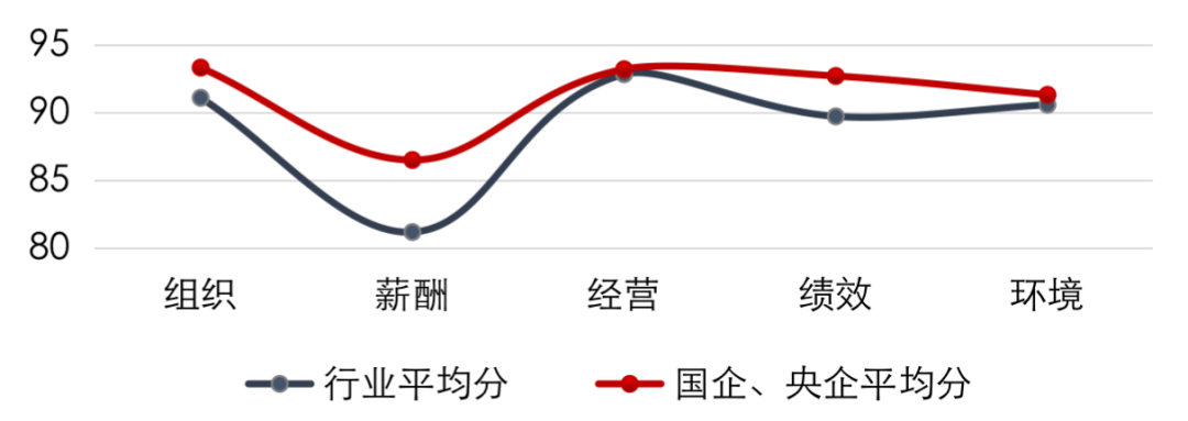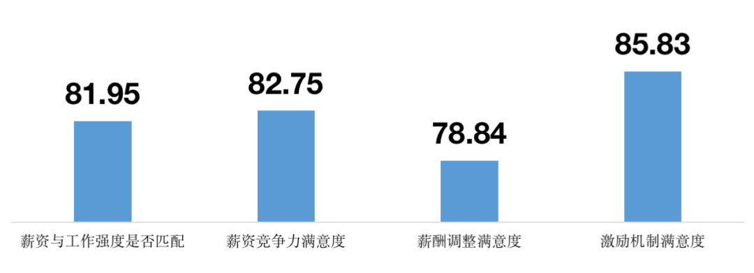 从调研的五个维度来看,员工平均满意度较高的是与企业组织、经营和环境相关的维度,而对薪酬和绩效的满意度相对较低。调研中,员工对调薪的及时性满意度较低,受访者平均满意度为78.84分,有11.5%的受访者认为公司薪酬调整不够及时,一般来说房企的薪酬调整周期为1-2年,部分房企没有普调,仅对绩效考核优秀的员工进行涨薪调整,导致员工对薪酬调整的及时性满意度较低。