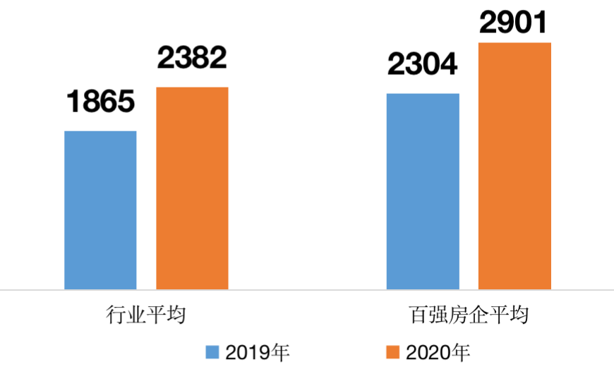 从操盘口径来看,2020年房企人均效能显著提升。其中行业人均销售额平均值为2382万元/人,百强房企人均销售额为2901万元/人,同比分别增长28%和26%涨。