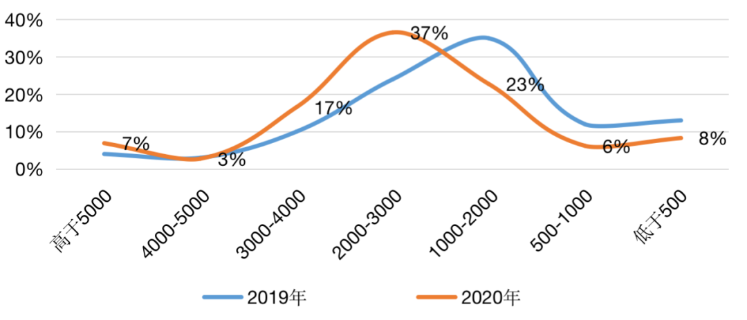 整体来看,有7%的企业在2020年人均销售额超过5000万元/人,较2019年上升3个百分点,滨江、中海等房企表现尤为突出,人均销售额已经突破6000万元/人。2020年有近四成房企人效位于2000-3000万元/人的区间,较去年大幅提升。