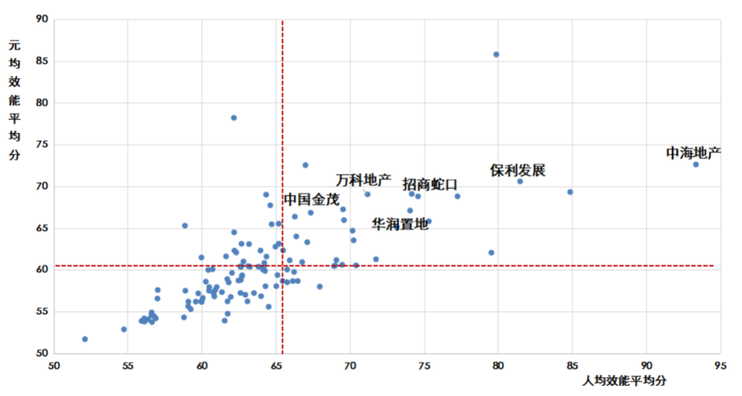在效能管理上,人效代表了效率,元效则代表了成本控制能力。对比两者来看,人均与元均都在行业前25%水平的企业中,国企、央企是主要力量,如中海、保利、招商、华润等人效和元效“双高”,体现出企业组织管理的能效较高,薪酬水平也控制得当,在人力资本价值方面表现强势。