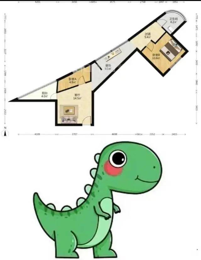 户型跟恐龙的轮廓类似,备受网友关注。“恐龙”头部是卧室、过道和卫生间,身体是狭长的厨房,腿部是客厅和另一个卧室,尾巴部分是阳台。