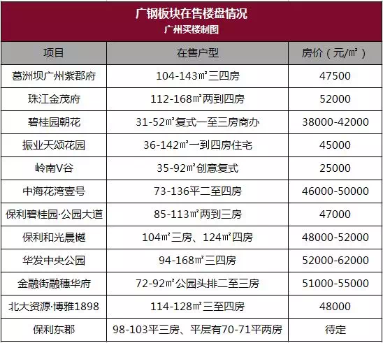 距离鹤洞村最近的广钢板块,楼盘云集,目前有货在售的就有11个,售价大多在4.5-5.5万/平之间。