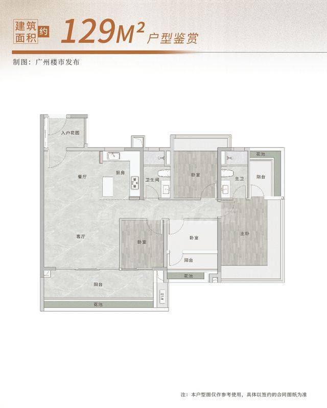 建面约129㎡产品,特地设计两间卧室可以分开/合并自由搭配。