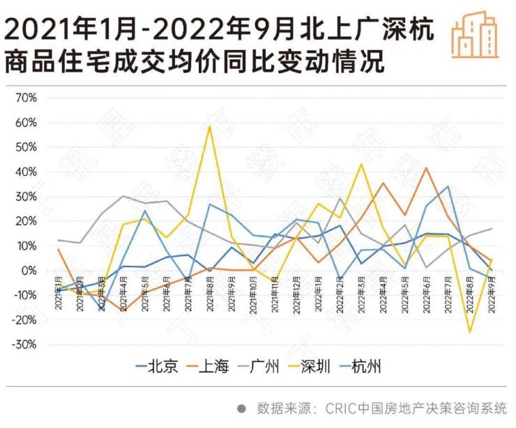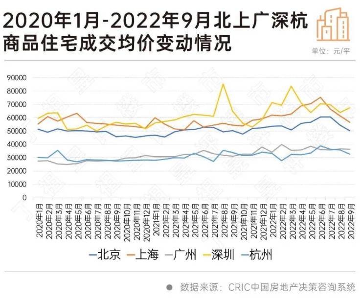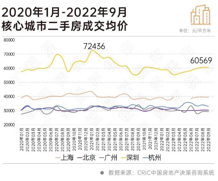 CRIC数据显示,2022年9月,深圳二手房成交均价由2020年末高点7.2万元/平方米下降至6万元/平方米,降幅达17%。上海、北京、广州和杭州二手房全市成交均价则持稳,同比波动均在3%以内。