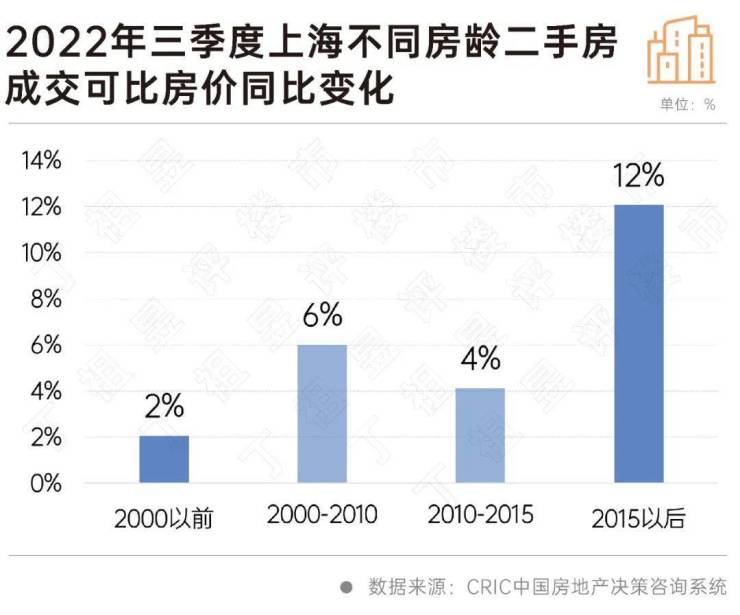 房龄5年以内的“次新房”是房价上涨的主要支撑,近3成2000年以前建成二手房房价跌幅超20%。2022年三季度,上海2015年以后建成的二手房成交可比房价同比上涨12%。2000年以前建成的二手房同比涨幅最小,仅2%。2022年三季度,成交的2000年以前建成的二手房中占比55%可比房价同比下降,其中27%房源同比降幅超过20%。