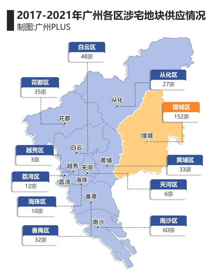 造成增城不断内卷的原因就是供应量太大,看2017年-2021年的整个广州宅地供应数量,增城共152宗地,占比高达57%,一区独揽了那一时期广州供地的半壁江山。