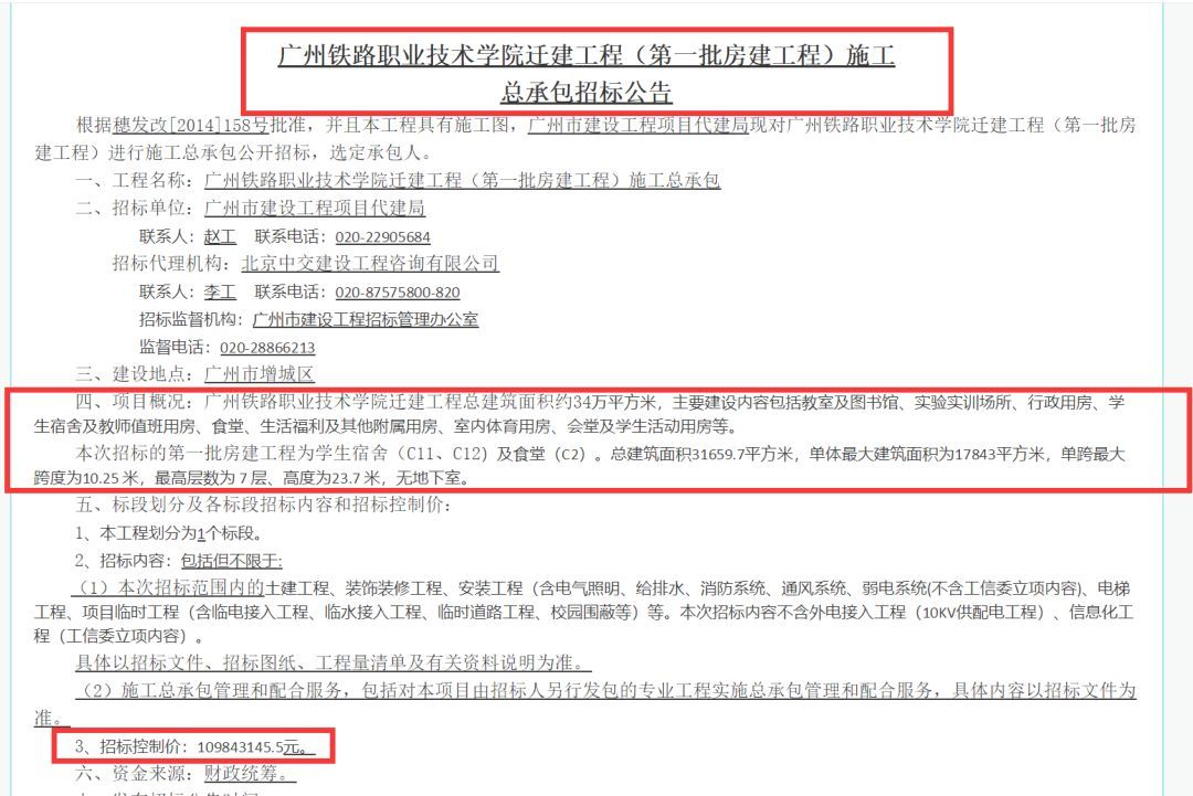 1月16日,广州公共资源交易网放出一则关于“广州铁路职业技术学院迁建工程(排名前列批房建工程)施工总承包”招标公告。