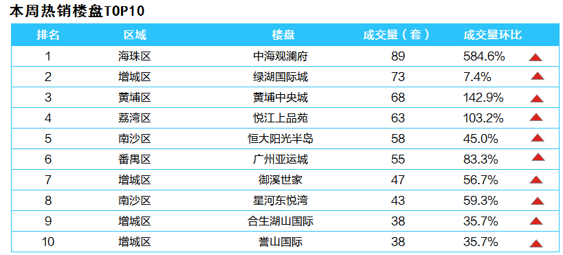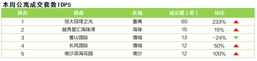 本周番禺区表现突出,主力项目恒大冠珺之光跑量60套,旧盘信业悦都汇现楼公寓尾货在售,价格低至1字头,本周成交11套。其余三个主力区项目的公寓成交零星,仅南沙滨海花园录得两位数的成交,交易12套。两市的交易则主要来自誉山国际和长风国际两个项目,分别成交13套、12套公寓。