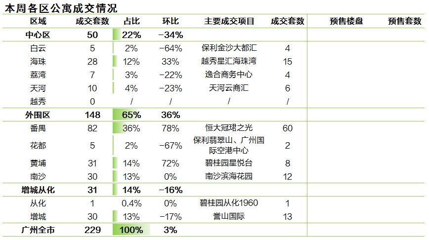 继前两周的新货扎堆入市后,本周广州公寓市场零供应。市场成交维持200+套的稳定水平,本周共成交229套,环比微涨3%。中心区除越秀星汇海珠湾的新货持续销售15套外,其余项目仅录得个位数的公寓交易,中心区整体成交量较上周下滑34%。而外围区市场热度回升,公寓成交量环比上涨36%。