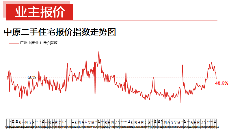 本周业主报价指数为48.6%,环比下降7.3%。随着市场逐渐回归理性,部分报高价楼盘已处长时间的挂牌,促使业主下调价格以加快成交。在这样的情况下,本周业主报价指数出现明显下滑,指数跌落至50%以下水平。