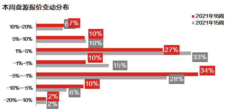 整体看,本周报价下调1%-5%之间的盘源占34.1%,较上周增加6.6%。而报价上调1%-5%以内的盘源占比则较上周减少6.0个百分点,共占26.7%。另外,本周报价上调5%-10%的盘源环比净减0.3个百分点,共占10.2%。