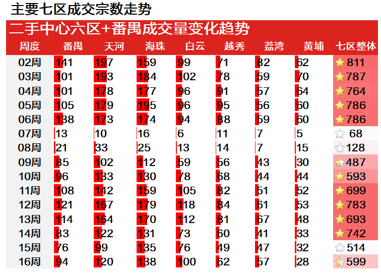 在主要七区中,大部分区域成交量均有所上扬。其中,白云、越秀、番禺三区整体表现相对亮眼。其成交分别为100宗、62宗、94宗,环比上涨31.6%、26.5%、23.7%。另外,海珠则仍以成交138宗位居各区榜首位置。此外,需要指出的是,本周黄埔需求不升反降,共成交28宗,环比下降1.55%。
