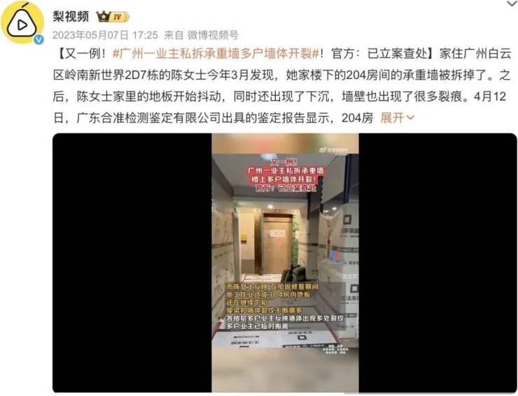 2023年,白云区某小区业主私自拆除承重墙和剪力墙,导致楼上多户墙体开裂、地板下沉,甚至整栋楼出现结构安全隐患。