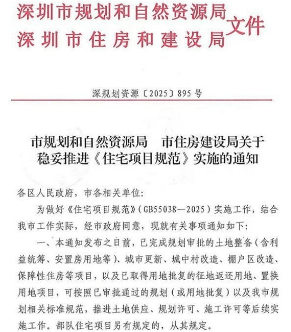 本月初,深圳规划和自然资源局、市住房和建设局联合发布关于稳妥推进《住宅项目规范》通知。《通知》明确,即日起报批建设的高度超80米住宅项目,须在土地供应和消防审查环节征求同级消防救援部门意见,确保建筑与城市消防救援能力相匹配,以刚性要求筑牢居住安全底线。