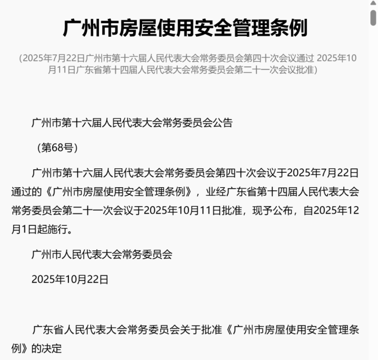 在广州,《广州市房屋使用安全管理条例》于近日经人大常委审议通过,将于12月1日起实施。