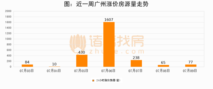 根据诸葛找房数据显示,广州24小时涨价房源量为77套,较07月08日增加12套,环比上涨18.5%。与此同时,涨价房源占比小幅扩大,业主信心有所提升。