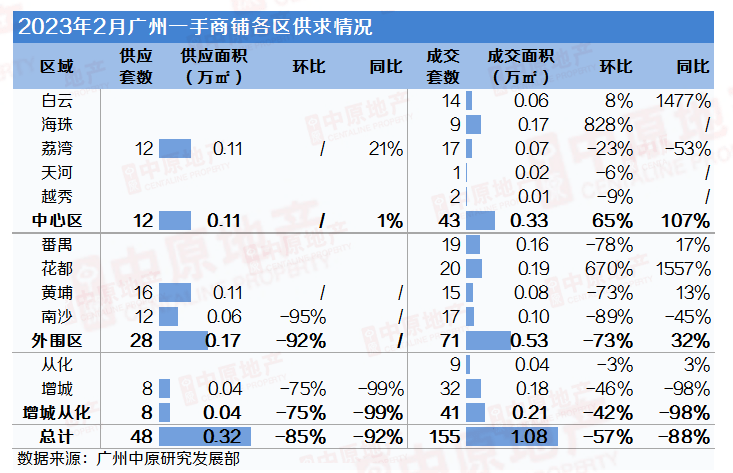 2月广州商铺市场缺少大宗交易,各区数据表现相对平淡,普遍较上月下降。