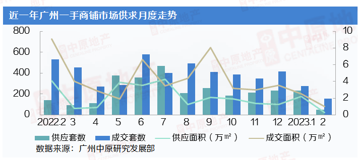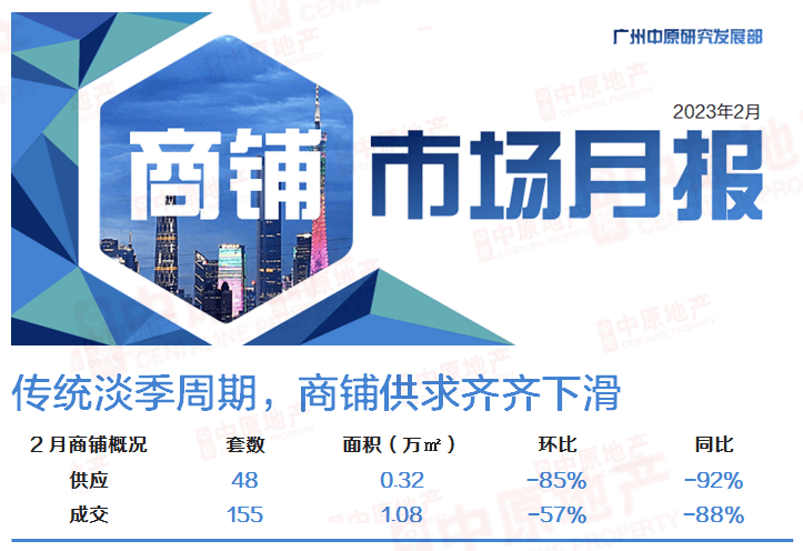 楼市进入传统淡季周期,2月广州商铺市场供求齐齐下滑,均录得近一年的最低位。