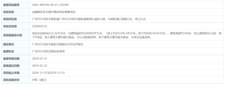 近日,广东政务服务网显示,天河区车陂村集体物业复建项目已通过备案。