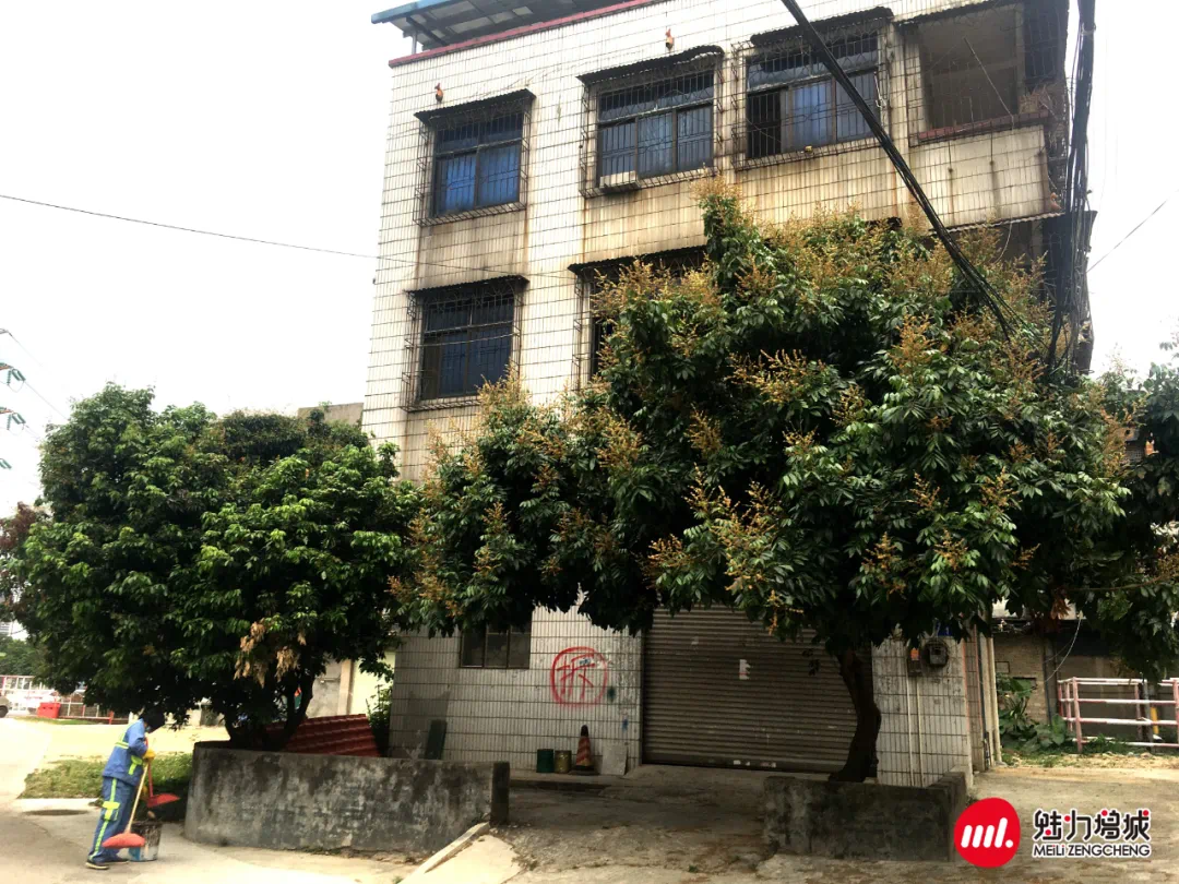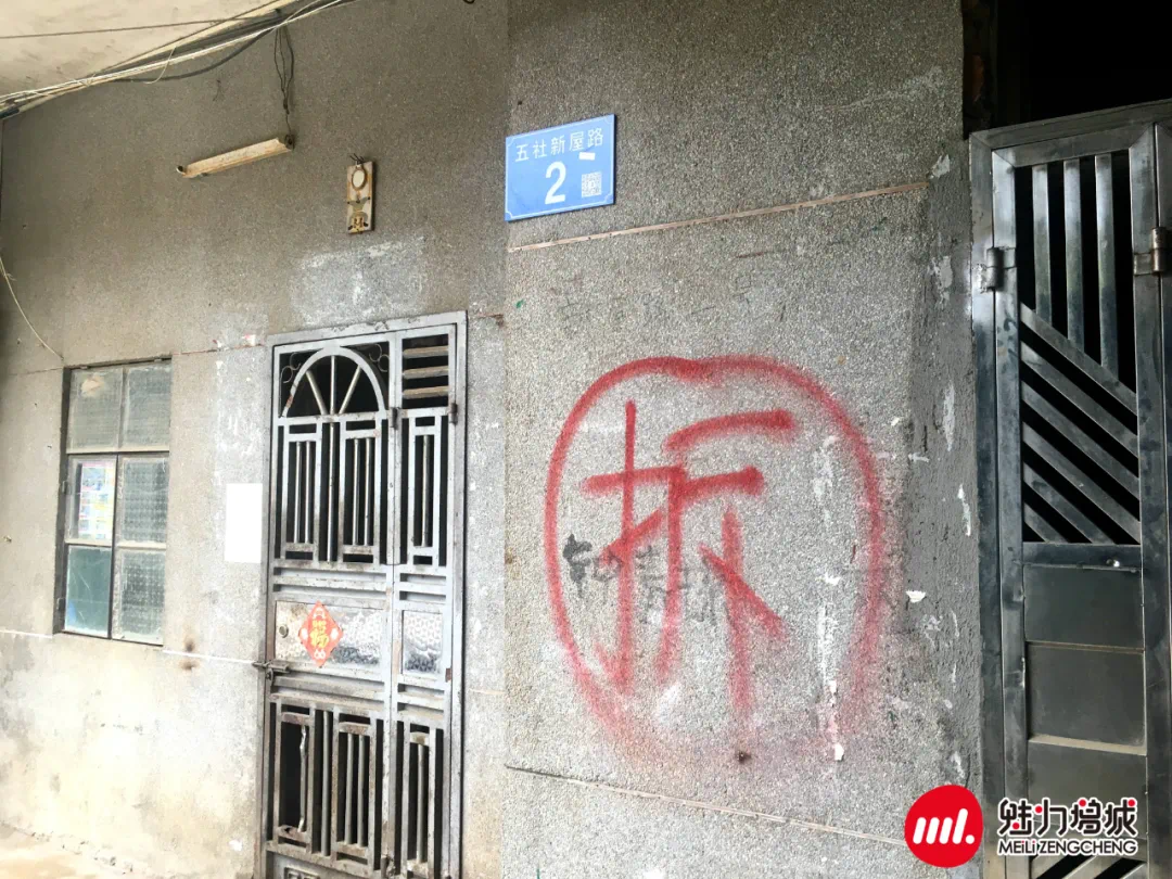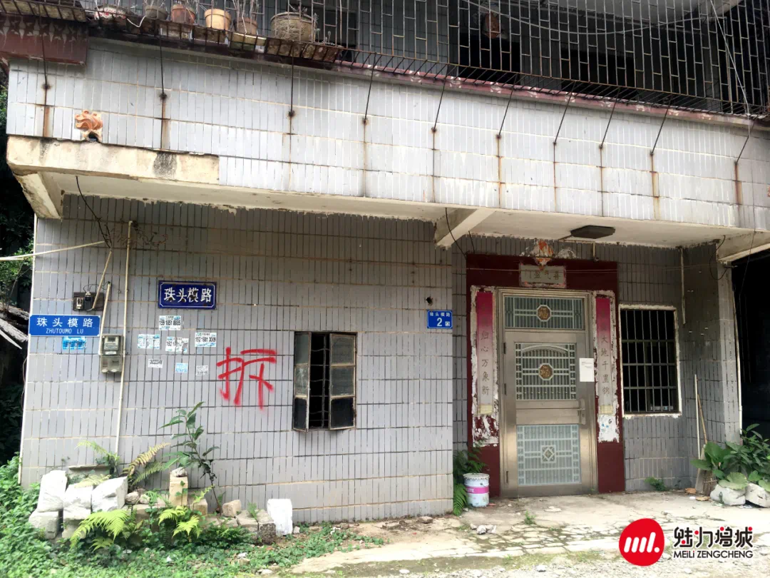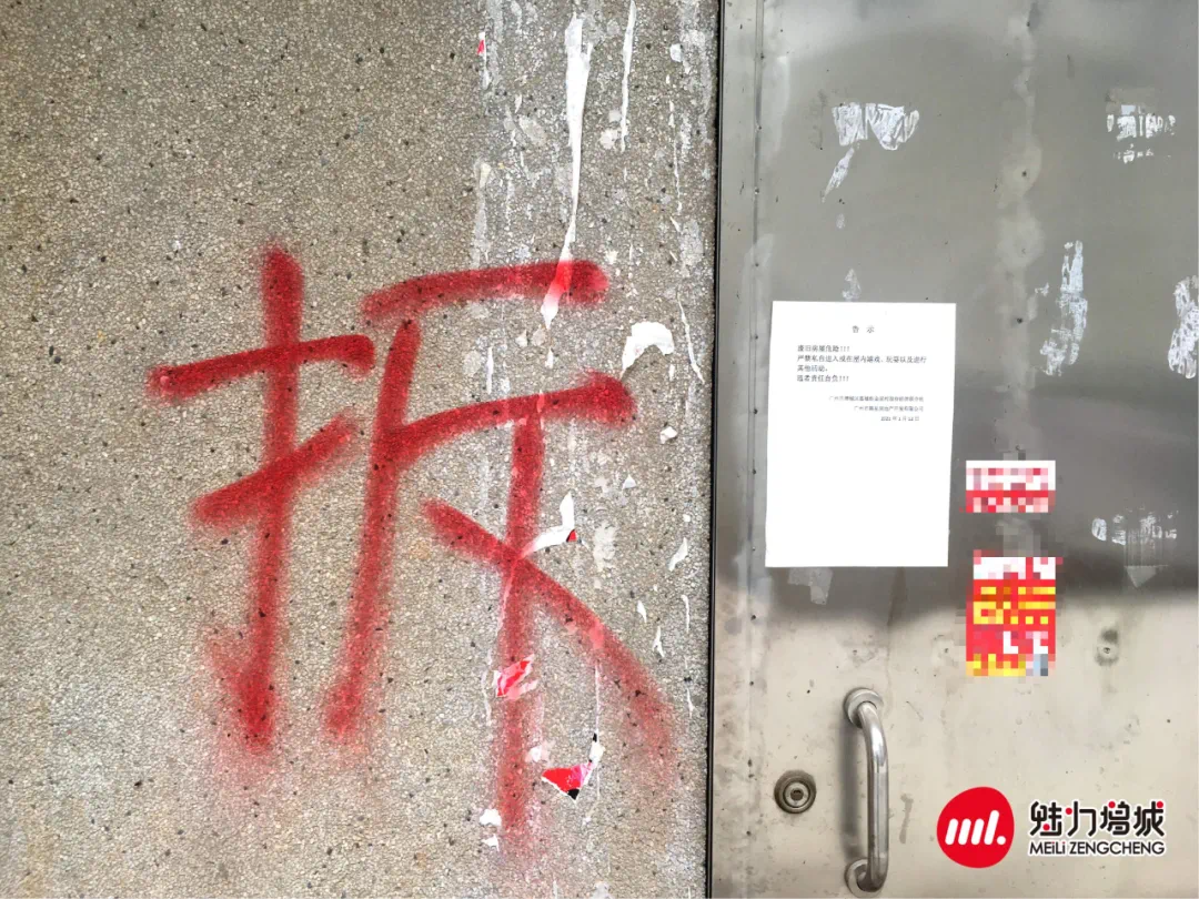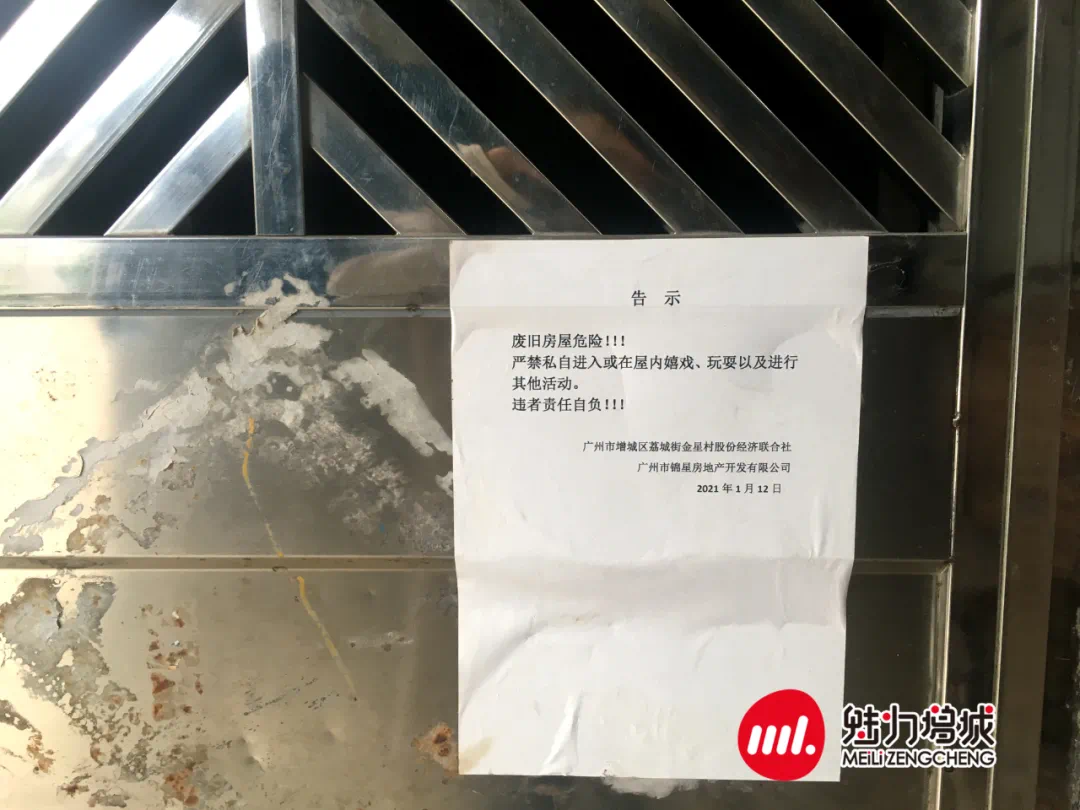 在拆字旁边还贴着一张告示,提示是废旧房屋危险,严禁私自进入!落款是广州市增城区荔城街金星村股份经济联合社和广州市锦星房地产开发有限公司。