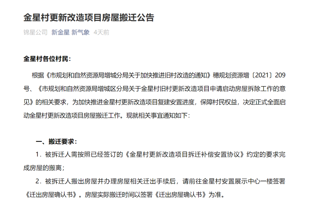 搬迁公告通知截图回顾一下,金星村旧改项目走过的路。2017年,金星村更新改造项目被列为广州市13个旧村全面更新改造项目之一。2019年1月,金星村与中鼎+融创正式合作参与旧改。2019年至2020年初,金星村拆迁补偿安置方案、实施方案已通过村民代表会议表决。2020年8月3日,开始启动金星村更新改造项目个人拆迁补偿协议签约。截至2021年4月1日,整村签约率已近7成,部分地块签约率已超8成。