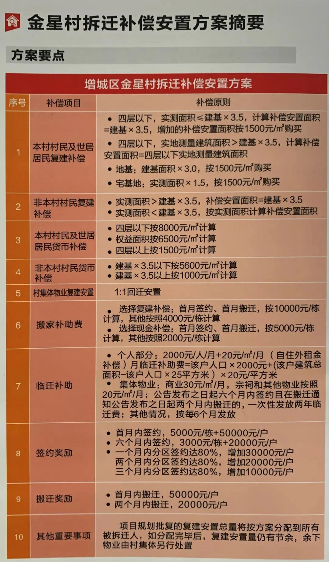 看上面这个图就知道补偿方案是怎样的,挑重点说一下,现状实测具备居住条件的房屋,四层以下,实测建面小于建基x3.5的房子,会按照建基x3.5计算;若是实测建面大于建基x3.5,则是按实测建面补偿安置。超过4层以上的部分则按照1500元/平给予补偿。据村民透露,目前村里的人至少一户能拿到回迁房300多平,最多能去到上数千平。另外,对于首批签约的人,还有不少奖励。首月搬迁能拿到搬迁奖励:50000元/户;首月签约能拿到签约奖励:5000元/栋+50000元/户;要是一月内签约能达到80%,增加30000元/户;首月搬迁的搬家补助费:10000元/栋。 今年拆除50%的现状建筑量 据房产君了解,金星村计划在2021年完成实施方案审批拆除50%的现状建筑量,开工建设至少50万平方米的安置区和公建配套设施的工作任务。项目安置启动区建设计划先行建设4栋村民的复建安置物业,计容建筑面积约10万平方米。