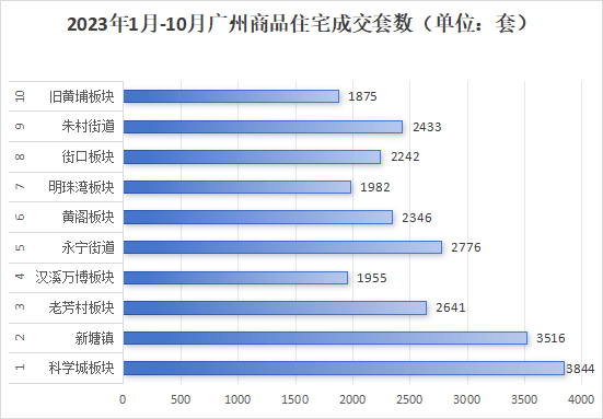 据克而瑞数据显示,在2023年1-10月份中广州各大板块成交排行中,科学城以3884套的成绩霸榜TOP1。