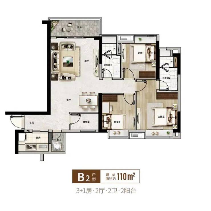 要想住得舒适一点,也可以考虑建面约110㎡三房两卫户型,独立玄关,私密性更强。