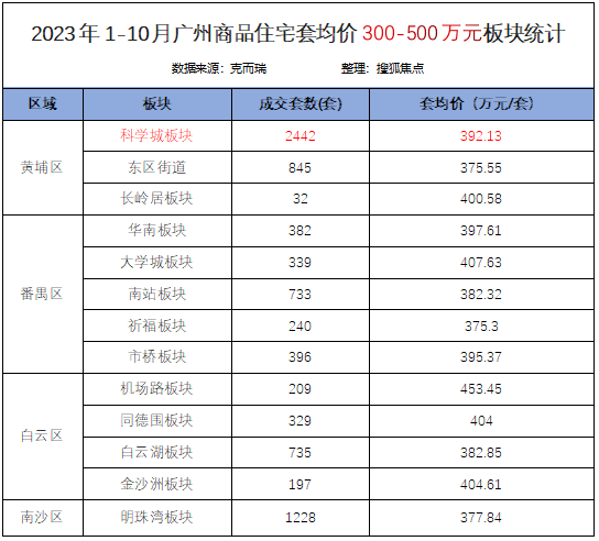 又比如,在克而瑞发布的广州商品住宅300-500万总价阶段,科学城1-10月份也以2442套的成绩位居TOP1,实力领先。