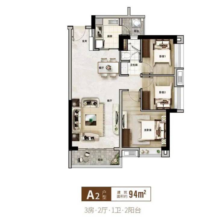 就拿建面约94㎡三房两卫入门级户型举例,餐客厅一体,双阳台的设计更是将生活与诗意直接区别开。