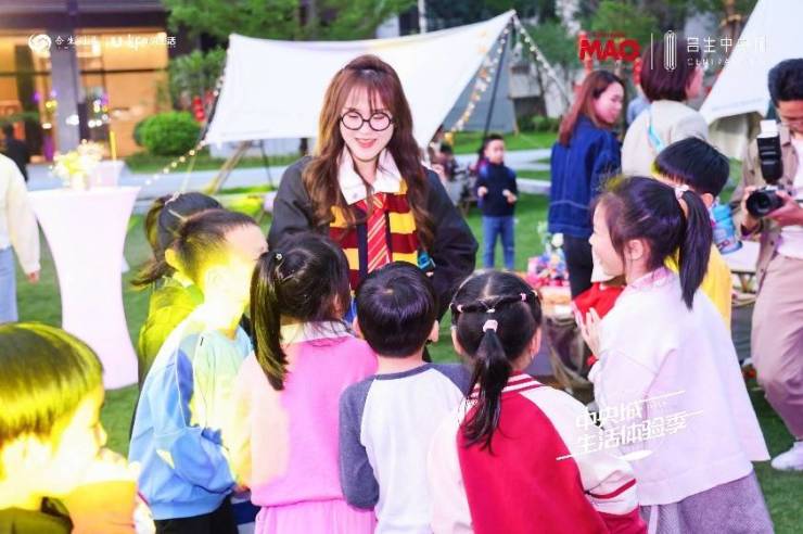 阳光大草坪上,霍格沃兹元素随处可见,换上魔法袍,家长给孩子拍照,亲子氛围浓郁。