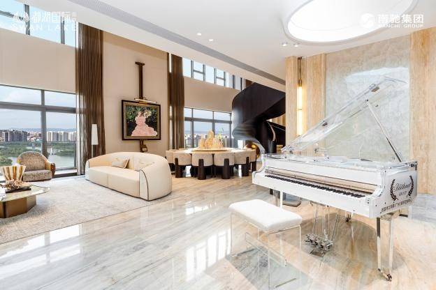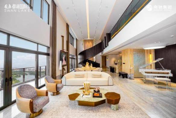 步入6栋【揽湖峯】顶层样板间,国际设计团队打造的“云端艺术馆”令人瞬间屏息。空间并非简单的物理容器,而是一场精心编排的“光与景的叙事”: