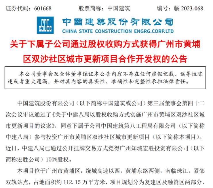 除了中建玖合,中国建筑还在11月2日公告称,下属子公司中国建筑第八工程局有限公司(以下简称中建八局)参与投资广州市黄埔区双沙社区城市更新项目(以下简称双沙项目)。中建八局通过收购知识城集团的全资子公司广州知城宏胜投资有限公司(以下简称宏胜公司)100%股权的方式间接持有项目公司约34.3%股权。上述股权收购完成后,广州市黄埔区红山街双沙股份经济联合社(以下简称双沙经联社)、中建八局(以宏胜公司为持股主体)、知识城集团持有的项目公司股权比例分别为51%、34.3%、14.7%。