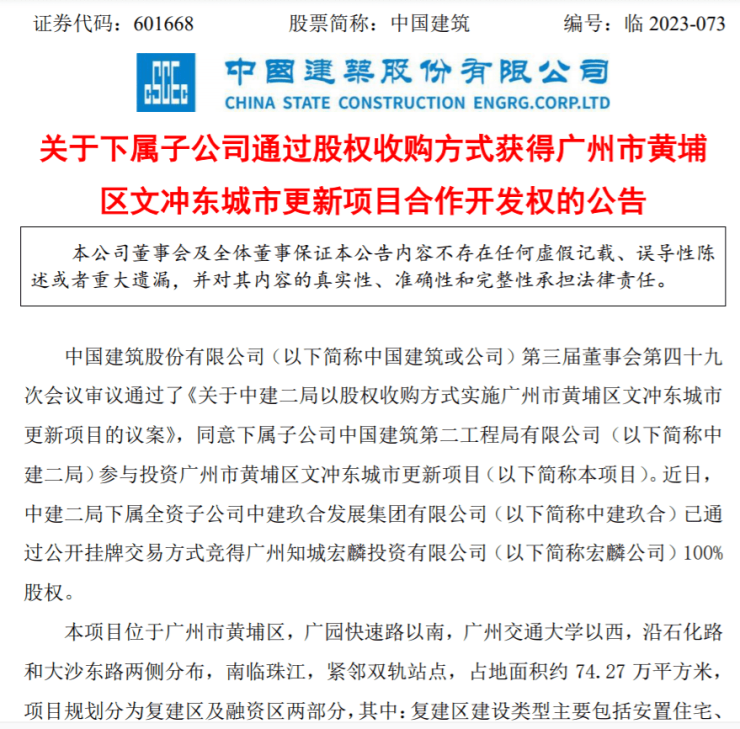 近日,中国建筑(SH601668,股价4.77元,市值2000亿元)公告称,同意下属子公司中国建筑第二工程局有限公司(以下简称中建二局)参与投资广州市黄埔区文冲东城市更新项目(以下简称文冲东项目)。