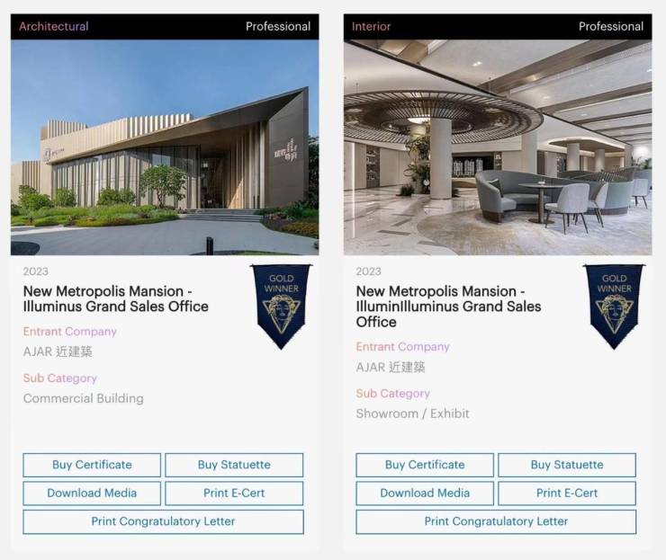 近日,2023 MUSE Design Awards (缪斯设计奖)宣布了2023年度的获奖名单。新世界耀胜尊府项目凭借其全球视野观、创设计概念斩获2023 MUSE 设计奖建筑设计类别—金奖,在国际奖项舞台上获得极大的肯定。